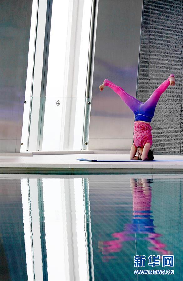 6月9日,在北京國貿(mào)大酒店78層游泳館,瑜伽愛好者練習(xí)瑜伽。