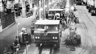1984年,當(dāng)年國(guó)慶受閱車從陜汽麥李西溝重型軍用汽車基地下線(新華社發(fā));2018年3月15日,卡車從陜重汽汽車總裝配廠下線(新華社記者 邵瑞 攝)。