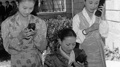 1993年8月14日西藏拉薩正式開(kāi)通“大哥大”成了新聞?lì)^條(新華社記者 范長(zhǎng)國(guó)攝),而2018年5月2日,在珠穆朗瑪峰旅游大本營(yíng)一家?guī)づ衤灭^內(nèi),游客用手機(jī)上網(wǎng)已是司空見(jiàn)慣(新華社記者 黃浩銘 攝)。
