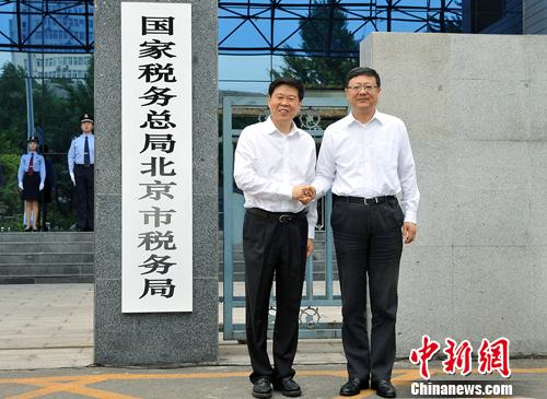 國(guó)家稅務(wù)總局黨組書(shū)記、局長(zhǎng)王軍與北京市委副書(shū)記、市長(zhǎng)陳吉寧共同為國(guó)家稅務(wù)總局北京市稅務(wù)局揭牌。國(guó)家稅務(wù)總局供圖