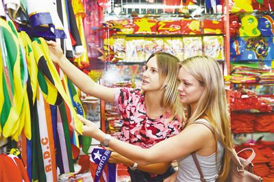 2018俄羅斯“世界杯”帶火浙江義烏體育用品。圖為6月13日,兩名俄羅斯客商在義烏國際商貿(mào)城采購球迷用品。人民視覺