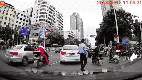 視頻顯示,6月13日中午11點(diǎn)06分,一名在湖南衡陽街頭執(zhí)勤的交警正要對(duì)一輛車號(hào)為“湘DE**26”的白色轎車進(jìn)行執(zhí)法。就在該轎車停車的瞬間,這名交警毫無征兆地倒在地上,而那輛白色的轎車本能地向后退了一下。