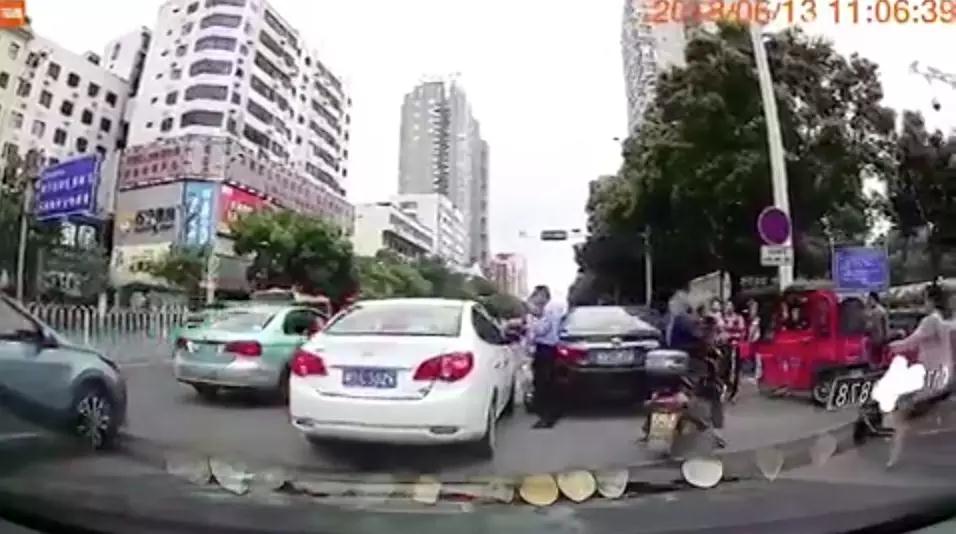 在另外一段視頻中,當(dāng)事交警坐在地上,一名穿著白色衣服的男子試圖攙扶起該交警,但被該交警拒絕。