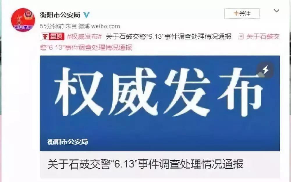 今天,湖南省衡陽市公安局官方微博發(fā)布“關(guān)于石鼓交警“6.13”事件調(diào)查處理情況通報(bào)”。