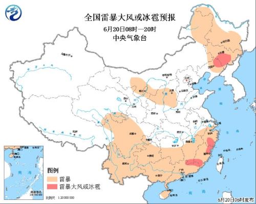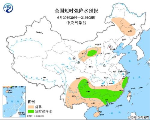 預(yù)計6月20日08時到21日08時,貴州、湖南中南部、江西、浙江、福建、廣東中北部、海南東北部、云南西南部等地的部分地區(qū)將有短時強降水天氣,小時雨強20-50毫米,局地可達60毫米以上;另外,內(nèi)蒙古中部和東部、吉林南部、遼寧東北部、浙江南部、福建北部和南部、廣東北部等地局地將有雷暴大風(fēng)或冰雹天氣。