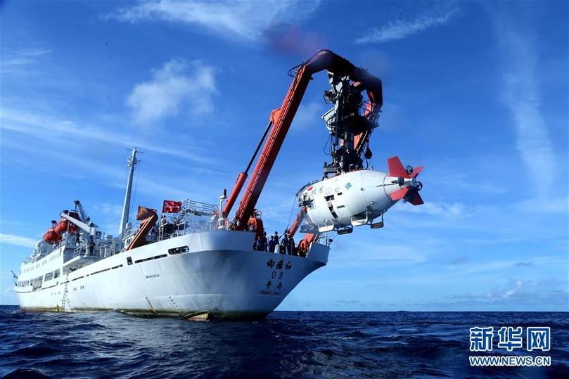 “蛟龍”號載人潛水器進入水中,進行中國大洋38航次最后一潛(2017年6月13日攝)。新華社記者 劉詩平 攝