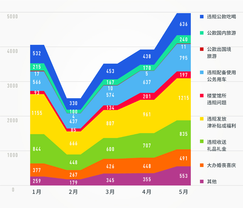 再來看,違反中央八項(xiàng)規(guī)定精神問題類型。從1至5月各類查處問題的面積分布圖來看,各類具體問題的查處趨勢(shì)也保持了較穩(wěn)定的增長態(tài)勢(shì)。值得注意的是,違規(guī)發(fā)放津補(bǔ)貼或福利、違規(guī)收送禮品禮金、違規(guī)配備使用公務(wù)用車、違規(guī)公款吃喝、大辦婚喪喜慶等問題類型,相比同期仍是所有問題類型的“大頭”(占據(jù)前5名),占比仍超80%。數(shù)據(jù)顯示,這些老問題,仍需下大氣力糾治,持之以恒,久久為功。