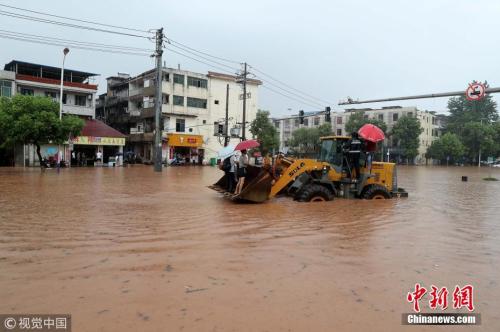 7月6日,江西省撫州市東鄉(xiāng)區(qū)遭遇特大暴雨襲擊,區(qū)城管局、水利局出動(dòng)鏟車(chē)、皮滑艇等工具,幫助市民渡過(guò)積水路段。何江華 攝 圖片來(lái)源:視覺(jué)中國(guó)