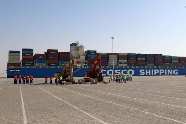 ↑2017年11月5日在阿聯(lián)酋拍攝的中遠(yuǎn)海運(yùn)港口阿布扎比碼頭正式動(dòng)工暨場站租賃簽約儀式現(xiàn)場。 新華社記者蘇小坡攝