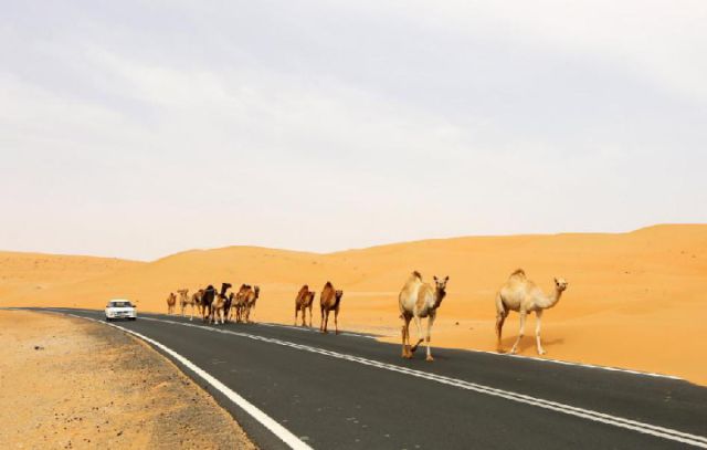 ↑2016年5月6日拍攝的阿聯(lián)酋的利瓦沙漠公路上的駝隊(duì)。 新華社記者 李震攝