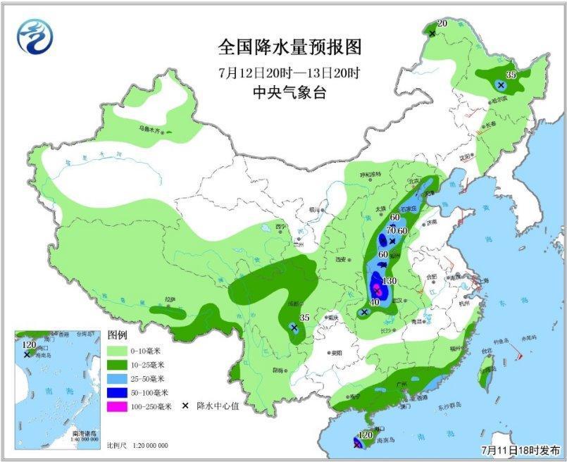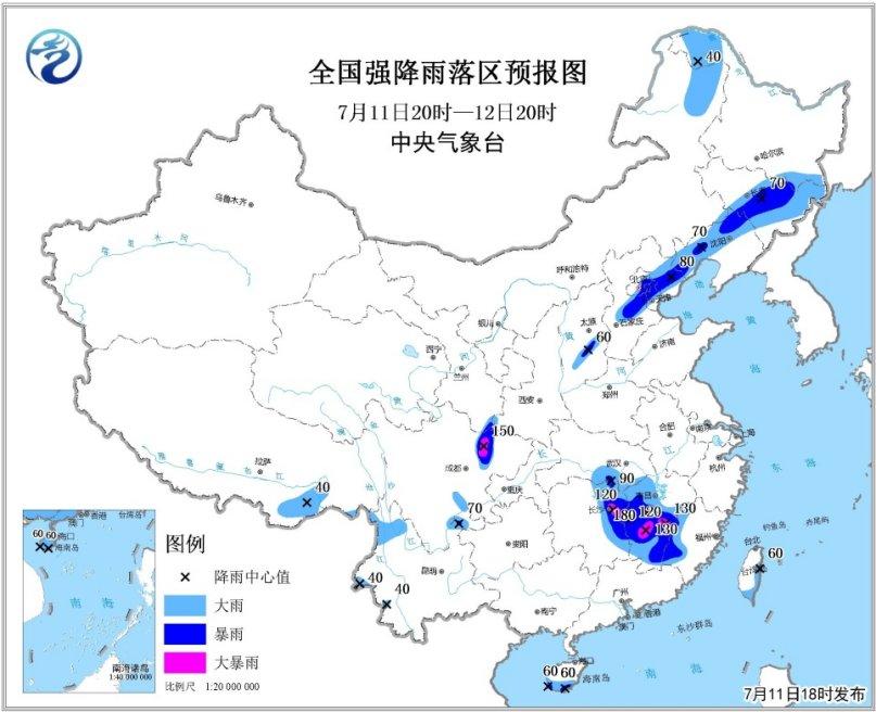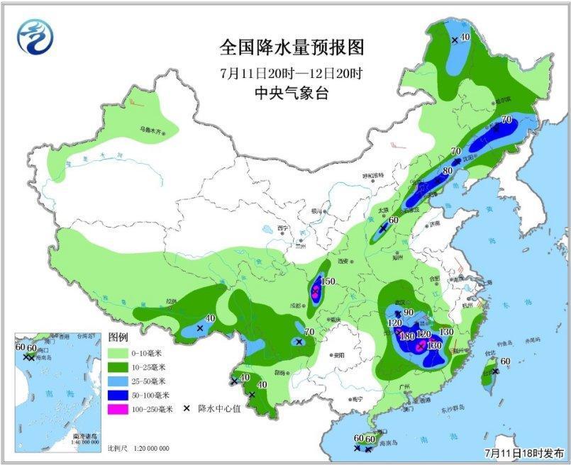 預(yù)計7月11日20時至12日20時,福建西部、江西、湖南東部、湖北東南部、四川盆地西北部和南部、山西中部、河北中部和東北部、北京東南部、天津中北部、遼寧西部和北部、吉林中東部以及海南島南部、云南西部等地有大雨或暴雨,其中,江西中部、湖南東北部、四川盆地西北部等地的局部地區(qū)有大暴雨(100~180毫米);上述地區(qū)最大小時降水量30~50毫米,局地60毫米以上(見圖1)。中央氣象臺7月11日18時繼續(xù)發(fā)布暴雨黃色預(yù)警。