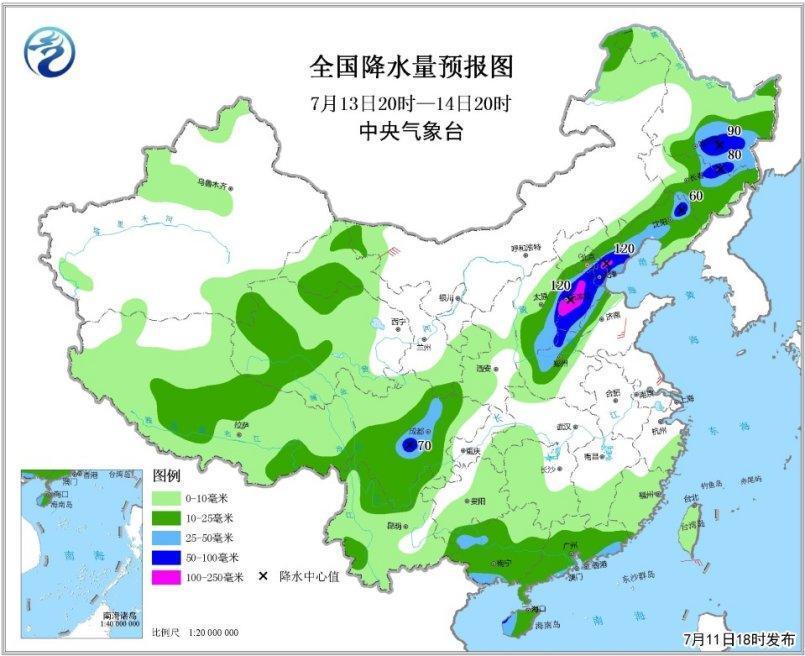 7月13日20時至14日20時,東北地區(qū)中南部、華北中東部、黃淮西北部、四川盆地西部等地有大到暴雨,局部有大暴雨(100~120毫米);上述局部地區(qū)將伴有短時強(qiáng)降水等強(qiáng)對流天氣(見圖4)。