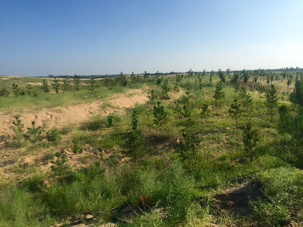 現(xiàn)在正處三北工程第五期階段,王海英說,當(dāng)下科左后旗所剩余的沙地造林地段,地理位置偏遠(yuǎn),相比以前來說,難度加大。一是交通不方便,以前可以機(jī)器造林,現(xiàn)在只能人工用車子拉進(jìn)沙地。二是以前可以裸栽,現(xiàn)在需帶土容器苗栽培,為了保護(hù)好樹根不折斷。三是澆水困難。造林當(dāng)年需在每三四百畝地之間打一口4—6寸口徑、深二十米左右的井,第二年以后就基本可以依靠雨水了。