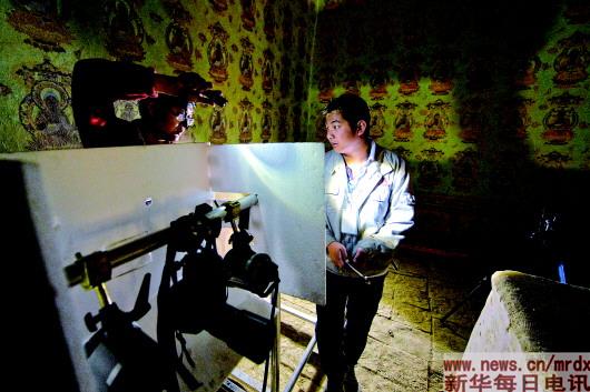 ▲工作人員對(duì)莫高窟第152窟進(jìn)行數(shù)字化采集?!z影:本報(bào)記者陳斌