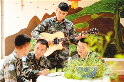 在聯(lián)合國馬里多層面綜合穩(wěn)定團(tuán)東戰(zhàn)區(qū)超級營地中國維和營內(nèi),有一支由中國第5批赴馬里維和部隊組成的“藍(lán)音樂隊”?!八{(lán)音樂隊”成員個個都是任務(wù)一線的骨干力量,經(jīng)歷過生死考驗之后,更加懂得生命的意義。圖為2018年5月12日,“藍(lán)音樂隊”成員交流歌曲心得。韓立建攝(新華社發(fā))