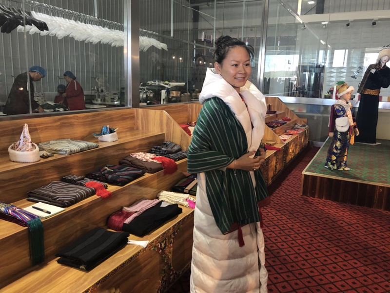 28歲的東格央宗拉姆對(duì)自己店內(nèi)的服裝如數(shù)家珍。她的服裝公司今年6月剛剛起步,當(dāng)?shù)卣悦吭旅科椒矫?0元的低租金為她這樣的創(chuàng)業(yè)者提供廠房。