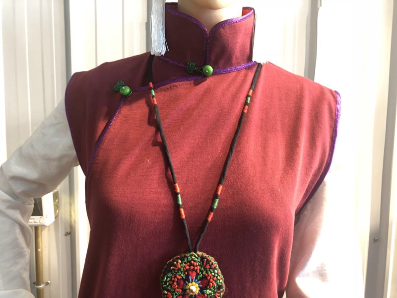 “這件衣服,我設(shè)計(jì)時(shí)結(jié)合了旗袍和藏族服飾的特征,盤扣采用了旗袍的設(shè)計(jì),但是領(lǐng)邊是藏服特有的設(shè)計(jì)。”