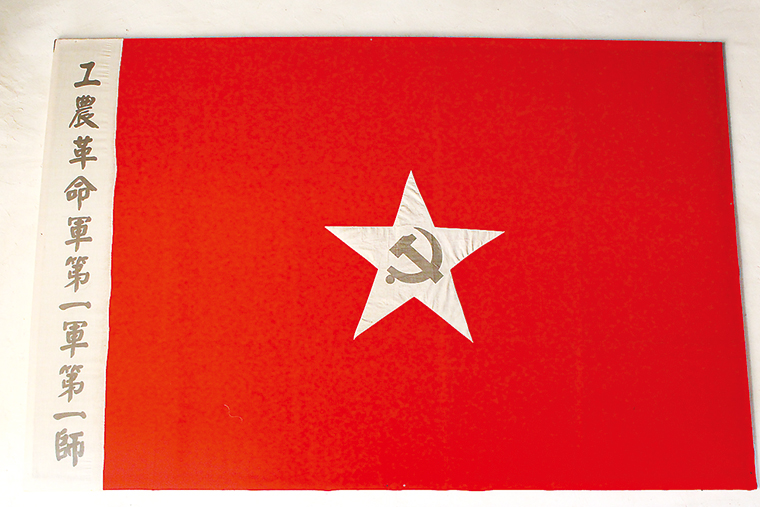 軍旗的樣式:旗底為紅色,象征革命;旗中央是白色的五角星,代表中國共產(chǎn)黨的領(lǐng)導(dǎo);五角星內(nèi)鑲嵌交叉的黑色鐮刀和斧頭,表示受苦受難的工農(nóng)大眾緊密團結(jié)起來;旗面左側(cè)靠旗桿一側(cè)有一條十厘米寬白布條,上面豎寫著“工農(nóng)革命軍第一軍第一師”黑色字樣的番號。這面莊嚴(yán)威武軍旗的完整含義是:工農(nóng)革命軍第一軍第一師是中國共產(chǎn)黨領(lǐng)導(dǎo)的工農(nóng)革命武裝。
