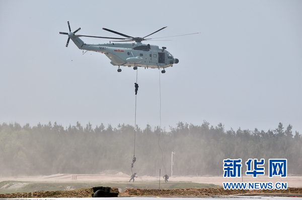 7月29日,在福建泉州賽區(qū)開幕式上,中國(guó)海軍陸戰(zhàn)隊(duì)在三棲立體登陸作戰(zhàn)課目軍事表演中搭乘艦載直升機(jī)滑降。當(dāng)日,“國(guó)際軍事比賽-2018”中國(guó)承辦賽事開幕式分別在新疆庫(kù)爾勒市和福建泉州市舉行。 新華社記者 姜克紅 攝