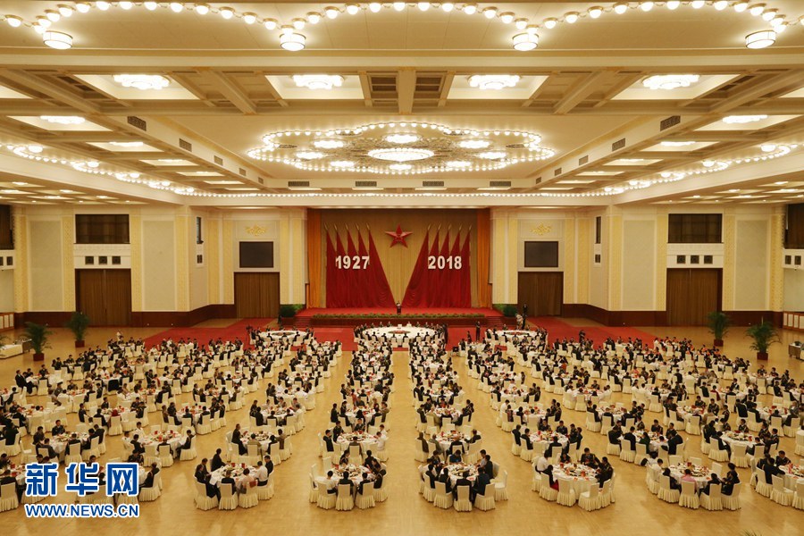 人民大會(huì)堂燈火輝煌、鮮花綻放,中外嘉賓歡聚一堂、共慶節(jié)日。主席臺(tái)帷幕中央懸掛著巨型“八一”軍徽,十面鮮艷的紅旗分立兩側(cè)?!?927-2018”醒目的大字熠熠生輝,昭示著中國(guó)人民解放軍走過(guò)了91年的光輝歲月,走進(jìn)新時(shí)代,踏上新征程。