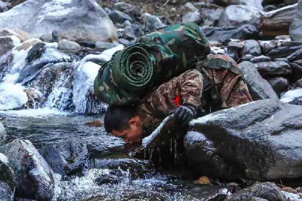 2018年1月10日,西藏一條邊防線上,一名巡邏戰(zhàn)士俯下身來喝冰水。圖片來源:中國青年報