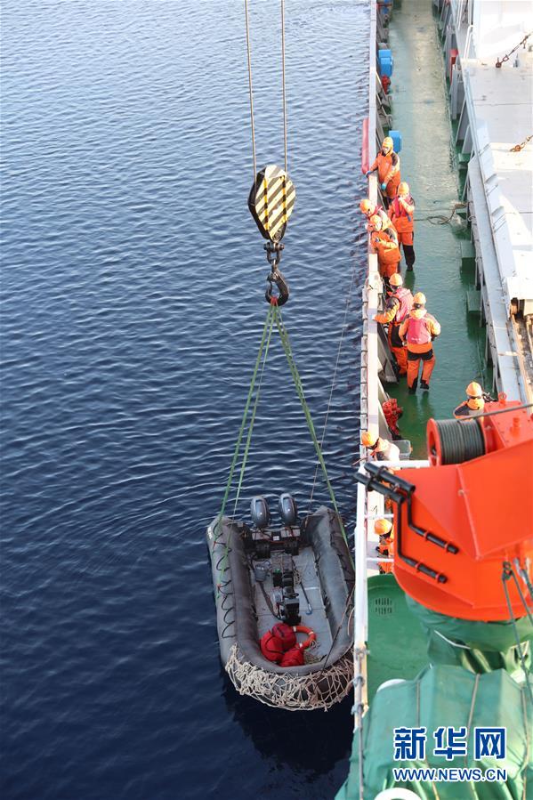 8月1日,北極科考隊隊員從“雪龍”號科考船上放出橡皮艇,準(zhǔn)備乘坐橡皮艇回收錨碇式潛標(biāo)。 新華社記者申鋮攝