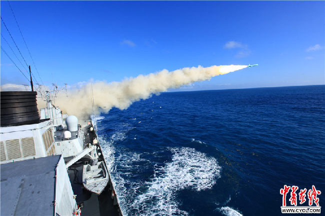 2008年11月8日,??谂炘谀澈S騾⒓訉?shí)彈演習(xí),圖為??谂灠l(fā)射反艦導(dǎo)彈。