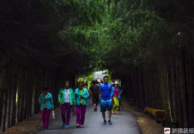 烏蘇佛山國(guó)家森林公園待甫僧景區(qū),游客走在綠蔭小道上。圖/新疆經(jīng)濟(jì)報(bào)新媒體中心記者 豆興軍
