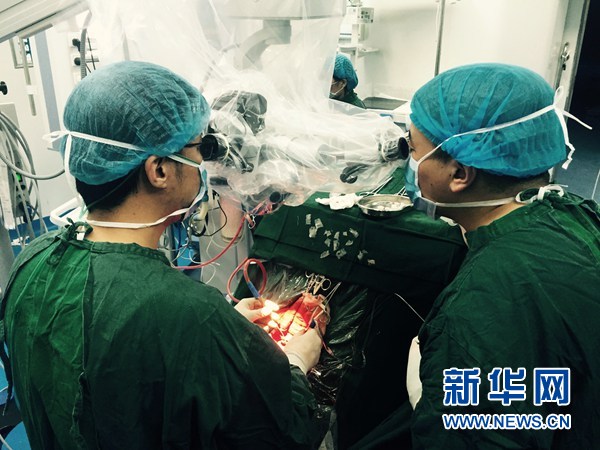 援藏醫(yī)生與那曲本地醫(yī)生在合作進(jìn)行手術(shù)(2017年11月24日攝)。 新華社發(fā)
