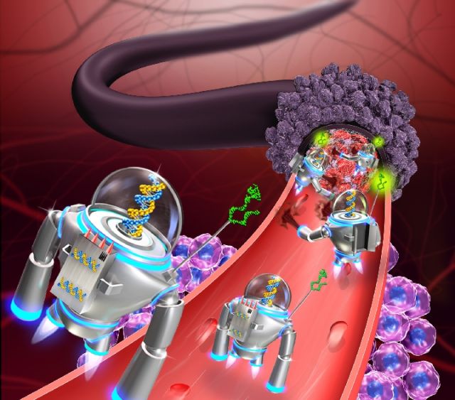 該團隊的丁寶全研究員通過精準控制,將一種包含7000多個堿基的噬菌體的DNA單鏈分子折成長方形板,放上四個“殺手”——凝血酶分子,然后再將其卷起來,接口處安裝用核仁素DNA片段做的“鎖”,最終形成90納米長、直徑為19納米的管狀機器人。
