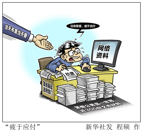 湖北省某縣委政研室干部說(shuō),一些黨員干部特別是領(lǐng)導(dǎo)干部能力不濟(jì),把發(fā)文、開會(huì)當(dāng)作抓落實(shí)的主要方式方法,甚至將其做成履職盡責(zé)、推卸責(zé)任的“痕跡”,一些文件層層轉(zhuǎn)發(fā)、照抄照轉(zhuǎn),很多時(shí)候并無(wú)新的實(shí)質(zhì)性內(nèi)容,完全是重復(fù)上級(jí)精神,造成基層干部有看不完的文件、開不完的會(huì)。