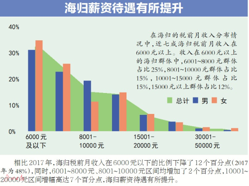22日,某招聘網(wǎng)站與某智庫機(jī)構(gòu)聯(lián)合發(fā)布了《2018中國海歸就業(yè)創(chuàng)業(yè)調(diào)查報告》,重點反映了以“90后”為主的新生代海歸群體在留學(xué)前后的發(fā)展變化。與去年相比,今年調(diào)查的海歸就業(yè)競爭力及薪酬均有提升,近七成海歸稅前月收入在6000元以上,月收入在10001~20000元區(qū)間的增幅達(dá)7個百分點。