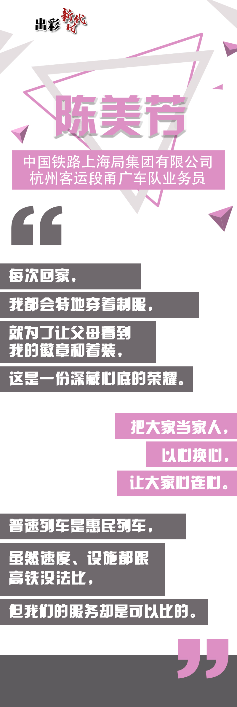 陳美芳是杭州客運(yùn)段甬廣車(chē)隊(duì)的業(yè)務(wù)員,曾做過(guò)10年列車(chē)長(zhǎng)的她,把一件件不起眼的小事辦成了大事,把普速列車(chē)變成了惠民列車(chē)。多年來(lái),她把乘客遇到的不便和小事記在小本上,解決這些“小事”,就是她心中“比什么都重要”的大事。乘客說(shuō):“這車(chē)慢,但慢有慢的人情味,慢有慢的風(fēng)景?!?