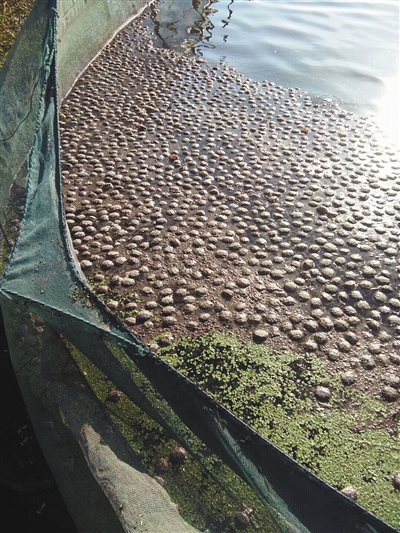 第二天,段廣玉發(fā)現(xiàn),大閘蟹也開始大量死亡,并浮出水面?!按箝l蟹死了之后,先沉下去,再浮上來,所以晚了一天?!睆?6日到28日,不斷有死螃蟹浮出水面,段廣玉總共撈了五六船大閘蟹?!叭妓拦饬?,沒浮上來的也爛在湖里了,數(shù)量無法計算?!?/p>
