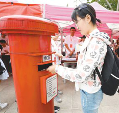 山東師范大學(xué)文學(xué)院新生將寫給自己的卡片寄到郵筒里,四年后,在他們畢業(yè)時將收到這張卡片留作紀(jì)念。人民視覺
