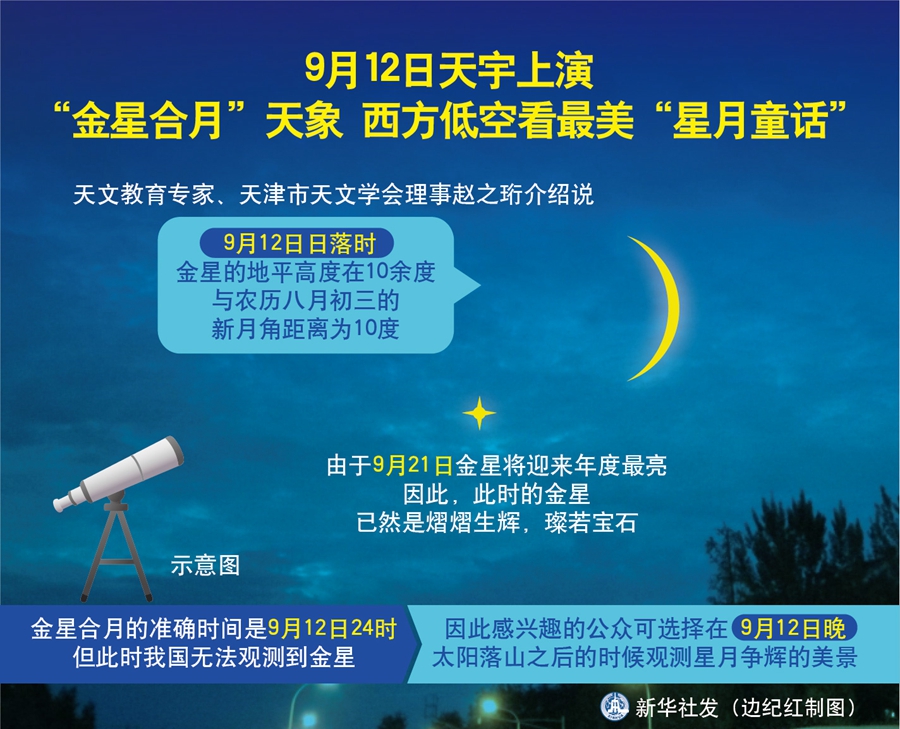 新華社天津9月10日電(記者周潤?。┨煳膶<医榻B說,作為行星合月里最美的一幕“星月童話”,“金星合月”12日晚將現(xiàn)身天宇,映美蒼穹。如果天氣晴好,感興趣的公眾抬頭仰望西方低空,憑借肉眼就可欣賞到“維納斯”與“月姑娘”相依相伴的美妙場景。
