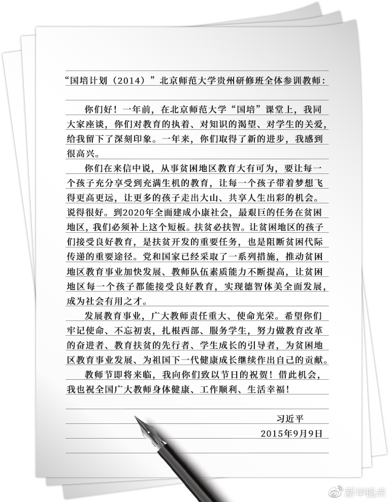 “要讓每一個(gè)孩子充分享受到充滿生機(jī)的教育,讓每一個(gè)孩子帶著夢想飛得更高更遠(yuǎn),讓更多的孩子走出大山、共享人生出彩的機(jī)會(huì)?!?015年,“國培計(jì)劃(2014)”北師大貴州研修班全體參訓(xùn)教師在給習(xí)近平總書記的信中這樣寫道。