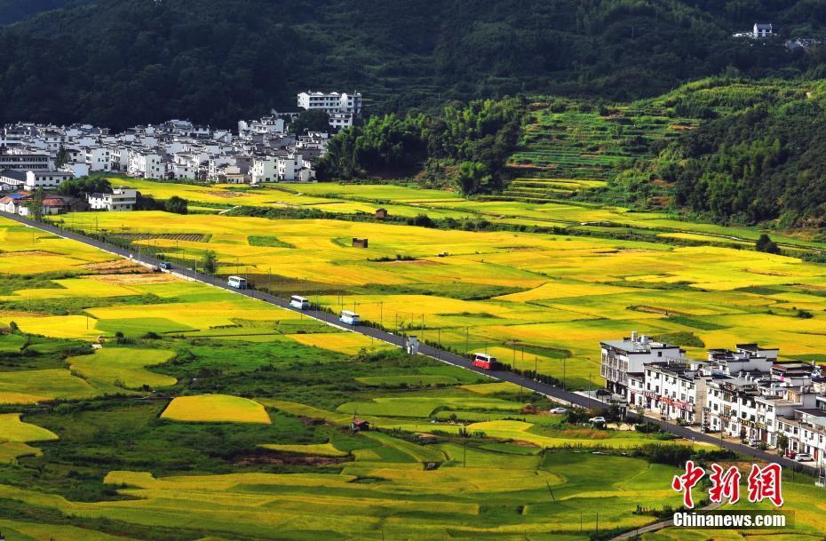 9月13日,在“中國最美鄉(xiāng)村”的江西婺源縣,正值收獲期的金黃水稻與周邊建筑構(gòu)成了一幅美好的田園豐收圖卷。中新社發(fā) 曹加祥 攝