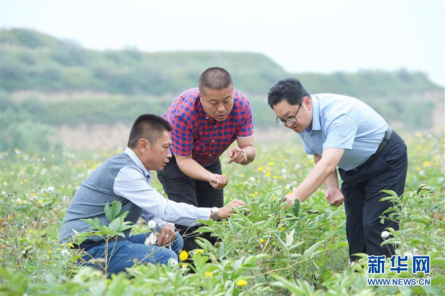 來(lái)自福建長(zhǎng)樂(lè)的林錦云(中)在寧夏固原市河川鄉(xiāng)與福建對(duì)口支援農(nóng)業(yè)專(zhuān)家(右)交流牡丹種植技術(shù)(8月28日攝)。2014年,林錦云通過(guò)土地流轉(zhuǎn)方式,承包了河川鄉(xiāng)1.5萬(wàn)畝荒山,打造油用牡丹生產(chǎn)基地。目前,林錦云種下的7600畝油用牡丹已經(jīng)開(kāi)始產(chǎn)生效益,公司已就近吸納村民300多人就業(yè),其中建檔立卡貧困戶(hù)39戶(hù),人均年收入2萬(wàn)多元。? 新華社記者姜克紅攝