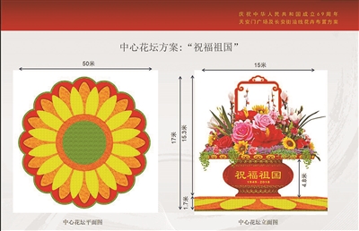 巨型花籃的北側(cè)是玻璃鋼制成的紅色籃體。今天凌晨,兩輛130噸吊車駛?cè)胩彀查T廣場,把花盤緩緩吊裝到籃體上。北京市花木有限公司相關(guān)負責人介紹,吊裝過程是有一定難度的,因為花盤體量大、分量重,要想平穩(wěn)、安全地吊裝到籃體上,需要精準把握平衡?!罢G闆r下,要花費一個小時左右才能完成。”吊裝完成后,整個花壇頂高17米,花壇底部直徑50米?;@體南側(cè)書寫“祝福祖國,1949—2018”,籃體北側(cè)書寫“歡度國慶,1949—2018”。