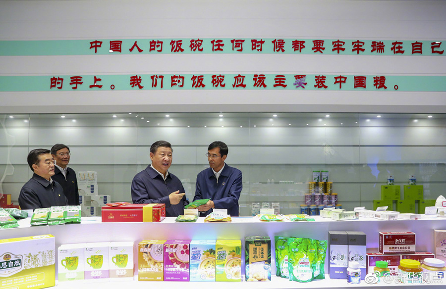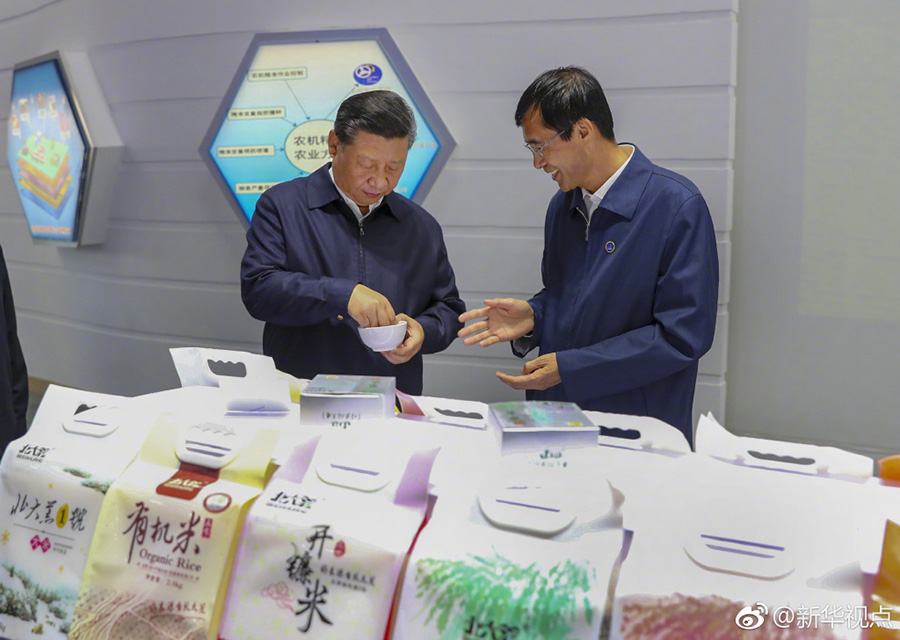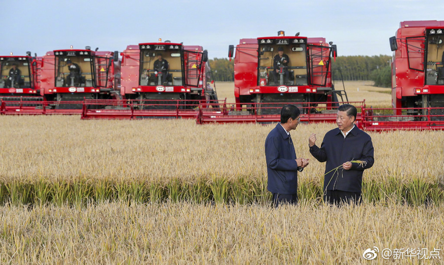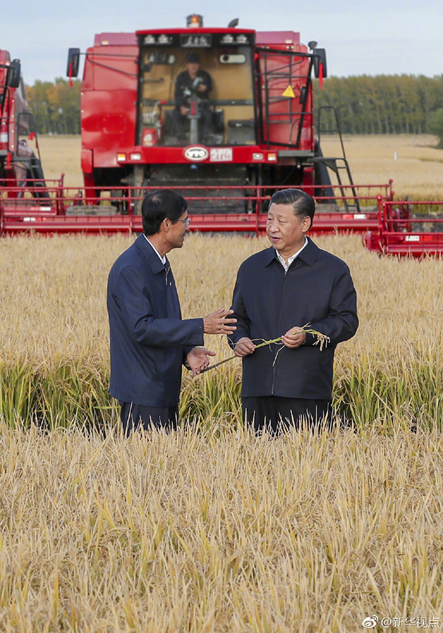 25日下午,首個(gè)“中國(guó)農(nóng)民豐收節(jié)”剛過,習(xí)近平就深入三江平原腹地黑龍江農(nóng)墾建三江管理局,考察糧食生產(chǎn)和收獲情況。他邊聽介紹,邊向農(nóng)場(chǎng)負(fù)責(zé)人詢問今年收成如何、有沒有病蟲害、能否做到連年豐收,并強(qiáng)調(diào)中國(guó)人的飯碗任何時(shí)候都要牢牢端在自己的手上。在北大荒精準(zhǔn)農(nóng)業(yè)農(nóng)機(jī)中心一樓大廳,當(dāng)?shù)爻霎a(chǎn)的米油豆奶等各類農(nóng)產(chǎn)品擺滿展臺(tái)。習(xí)近平走近前去,雙手捧起一碗大米,意味深長(zhǎng)地說(shuō):“中國(guó)糧食,中國(guó)飯碗?!保ㄎ淖郑簭垥运?攝影:謝環(huán)馳)