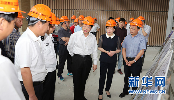 浙江省湖州市委副書(shū)記、市長(zhǎng)錢三雄(前右三)檢查位于德清縣的首屆聯(lián)合國(guó)世界地理信息大會(huì)項(xiàng)目建設(shè)(2018年6月10日攝)。新華社發(fā)