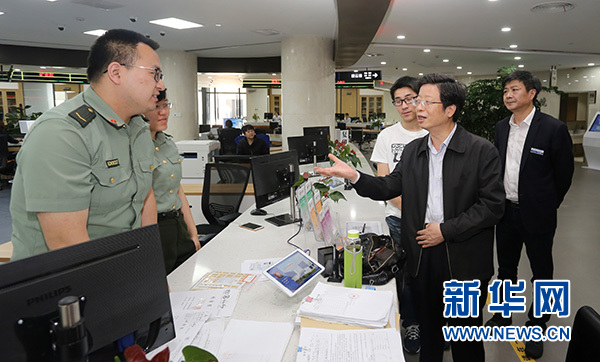 浙江省湖州市委副書(shū)記、市長(zhǎng)錢三雄(右二)在湖州市民服務(wù)中心調(diào)研指導(dǎo)“最多跑一次”改革工作(2017年5月10日攝)。新華社發(fā)