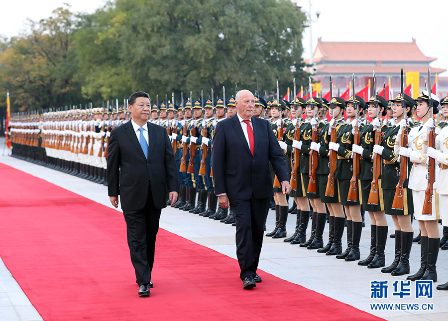 10月16日,國家主席習近平在北京人民大會堂同挪威國王哈拉爾五世舉行會談。這是會談前,習近平在人民大會堂東門外廣場為哈拉爾五世舉行歡迎儀式。 新華社記者 劉衛(wèi)兵 攝