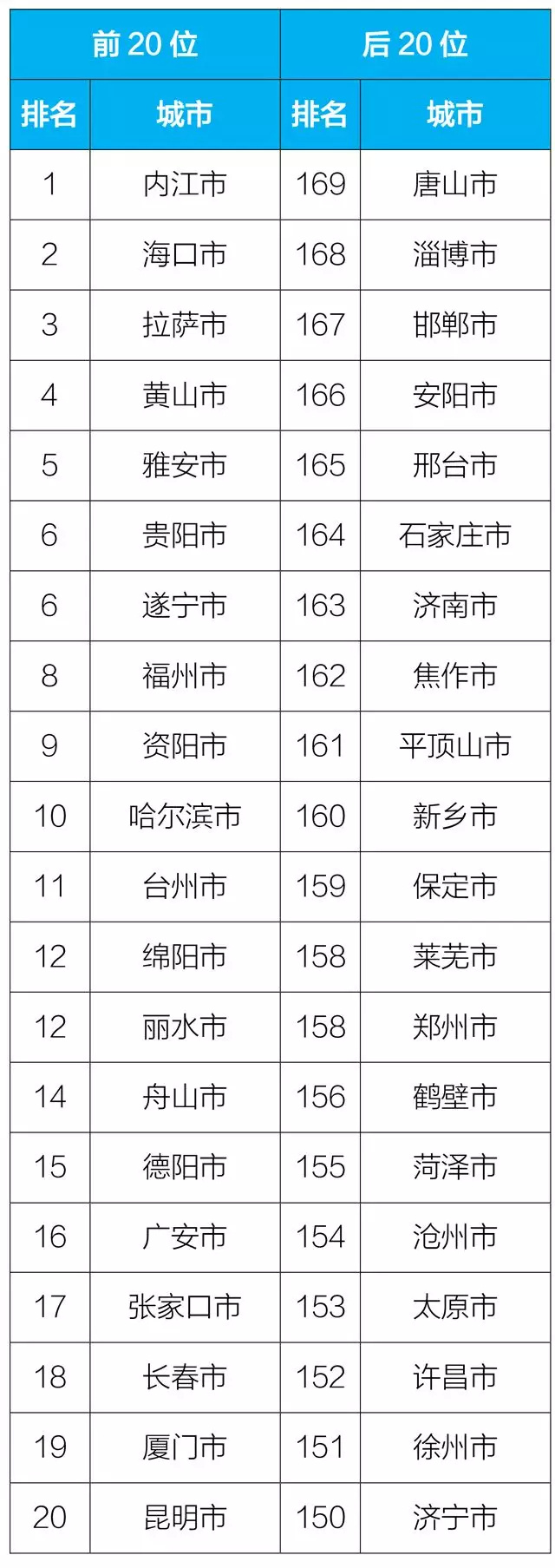 2018年9月169個重點城市排名前20位和后20位城市名單