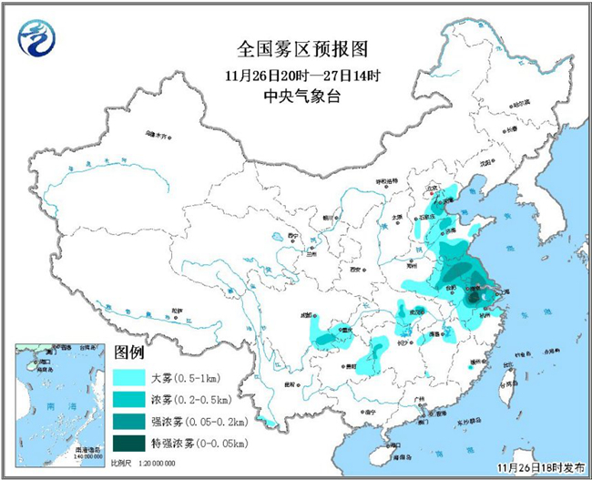 馬學(xué)款:根據(jù)實況監(jiān)測數(shù)據(jù),11月26日早上,河北中南部、北京東南部、天津、山東中西部、河南中東部、安徽中北部等地出現(xiàn)濃霧或中到重度霾;河北、河南、山東、安徽等地部分地區(qū)有能見度不足50米的特強濃霧。26日晚上起,受冷空氣影響,華北平原大霧逐漸減弱或消散。
