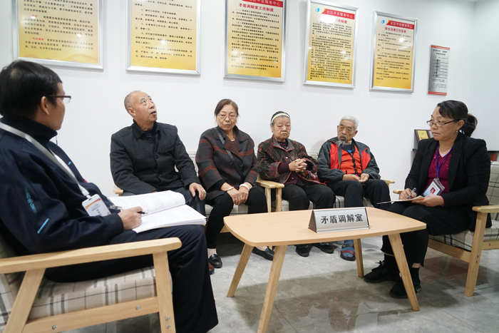 社區(qū)“順順吧”的街道干部、法院民警、駐點(diǎn)律師、街道民調(diào)員主動(dòng)上門,通過多方調(diào)查了解,多次上門幫老人召開家庭會(huì)議,從法律、情理等多角度耐心勸說。馮婆婆一家最終達(dá)成協(xié)議,每位子女公平分配,且共同承擔(dān)老人的贍養(yǎng)義務(wù),一家人重歸于好。