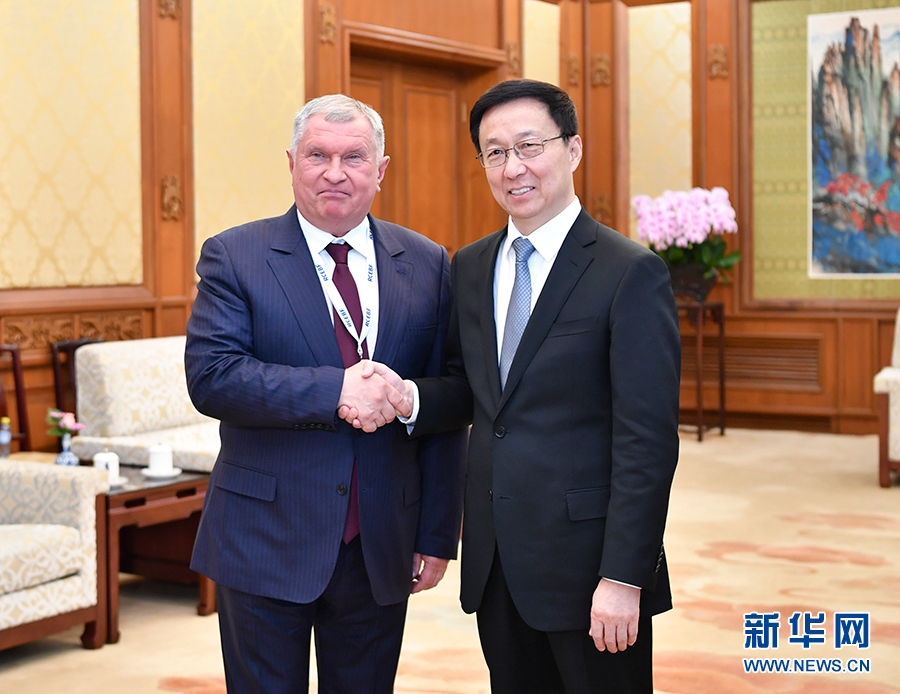 11月29日,中共中央政治局常委、國務院副總理韓正在北京釣魚臺國賓館會見來華出席中俄能源商務論壇的俄羅斯聯(lián)邦總統(tǒng)能源發(fā)展戰(zhàn)略和生態(tài)安全委員會執(zhí)行秘書、俄羅斯石油公司總裁謝欽。新華社記者 殷博古 攝