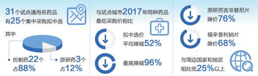 擬中選結(jié)果顯示,31個試點通用名藥品有25個集中采購擬中選,成功率81%。其中,通過一致性評價的仿制藥22個,占88%,原研藥3個,占12%。與試點城市去年同種藥品最低采購價相比,擬中選價平均降幅52%,最高降幅96%。原研藥吉非替尼片降價76%,福辛普利鈉片降價68%,與周邊國家和地區(qū)相比低25%以上。