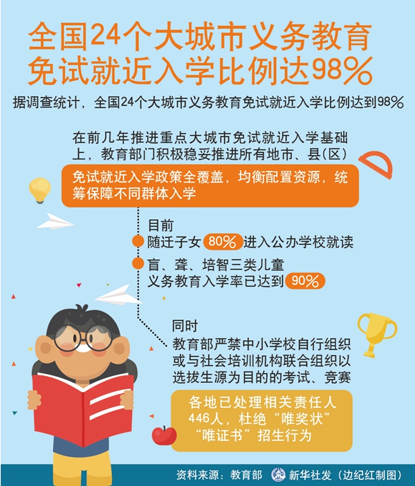 全國24個(gè)大城市義務(wù)教育免試就近入學(xué)比例達(dá)98% 新華社發(fā) 邊紀(jì)紅 制圖